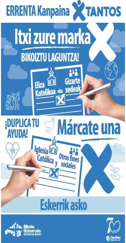Caritas Bizkaia y la Diócesis de Bilbao han puesto en marcha la campaña “Márcate una X dejando tu marca en Bizkaia” con motivo del inicio de la campaña de la Declaración de la Renta, con el objetivo de animar a la ciudadanía a marcar la casilla de “Iglesia Católica y otros fines sociales”, una decisión que no supone ningún coste adicional para las personas contribuyentes y que permite sostener una amplia red de acción social y pastoral en Bizkaia.