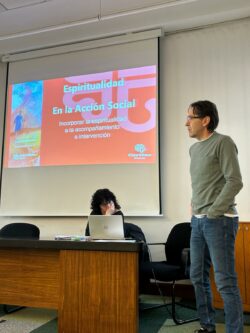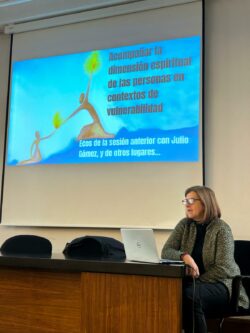 En continuidad con el año pasado en el que se inició esta reflexión, se comenzó con una oración acompañada por Borja Uriarte (Uribe Kosta) seguida del recordatorio de los aprendizajes y convicciones fruto del encuentro del año pasado con Julio Gómez que realizó Belén Rodero, consiliaria de Cáritas Portugalete. Y a continuación, se dio paso a la ponencia en la que Mar Ortiz y Luis Mari Vega compartieron reflexión y testimonio de la experiencia del trabajo de Caritas Bizkaia en la dimensión espiritual de las personas acompañadas en sus proyectos.