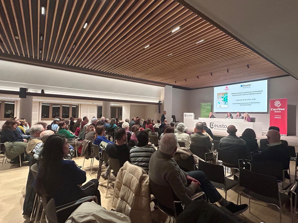 Bilbao, 28 de enero de 2026. Cerca de 200 personas asistieron ayer por la tarde a la presentación del Informe FOESSA Euskadi, organizada por Caritas Bizkaia y el equipo Deusto Valores Sociales de la Universidad de Deusto, en el Auditorio Icaza de la propia universidad. En total, participaron 197 personas, 119 de ellas de forma presencial y 78 en modalidad online, fundamentalmente representantes de entidades del tercer sector de Bizkaia, administraciones públicas, así como voluntariado y personal contratado de Caritas. El acto fue inaugurado por el rector de la Universidad de Deusto, Juan José Etxeberria, y por la directora de Caritas Bizkaia, Elena Unzueta y contó con la presencia del Obispo de la Diócesis de Bilbao, Joseba Segura.