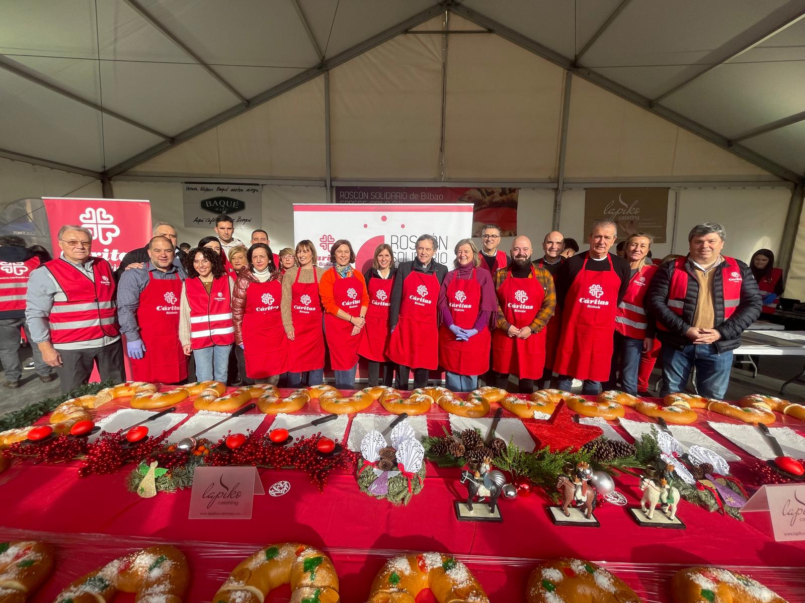 Caritas Bizkaia en colaboración ha organizado el roscón solidario de Bilbao con la Asociación de Comercio, Hostelería y Empresas del Casco Viejo Zazpi Kaleak. La elaboración del Roscón este año ha corrido a cargo de Euskofriz, en coordinación con Lapiko Catering y LogiFénix Bilbao. Hemos contado con el apoyo del GRUPO GASCA, y los ingredientes para las raciones de chocolate han sido donados para la ocasión por Kaiku (leche) y Baqué (cacao).