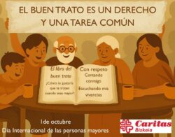 Desde el Área de Mayores y Envejecimiento de Caritas Bizkaia queremos impulsar una mirada diferente del envejecimiento, una mirada que reconozca el valor de las personas y de su vida independientemente de su edad. Soñamos con una sociedad en la que todas las personas sean respetadas y en la que las relaciones de buen trato nos acompañen durante toda la vida. Y por ello, recordamos hoy la jornada del 15 de junio, Día Mundial de Toma de Conciencia sobre el Maltrato y el Abuso en la Vejez, en el que “escribimos” un libro colectivo e intergeneracional sobre el buen trato, durante un acto de calle en el Casco Viejo de Bilbao. Próximamente tendremos oportunidad de leerlo ya que lo estamos digitalizando para compartirlo en esta misma página web.